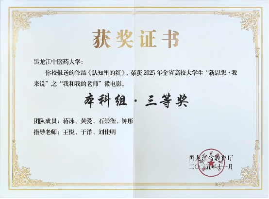 在2025年全省高校大学生“新思想我来说”主题展示活动中,由思政教研室主任刘佳明老师领衔,王悦、于洋两位老师全程指导,蒋泳、黄爱、石崇衡、钟彤等同学自编自导自演的微电影《认知里的红》,荣获“我和我的老师”微电影本科组三等奖。